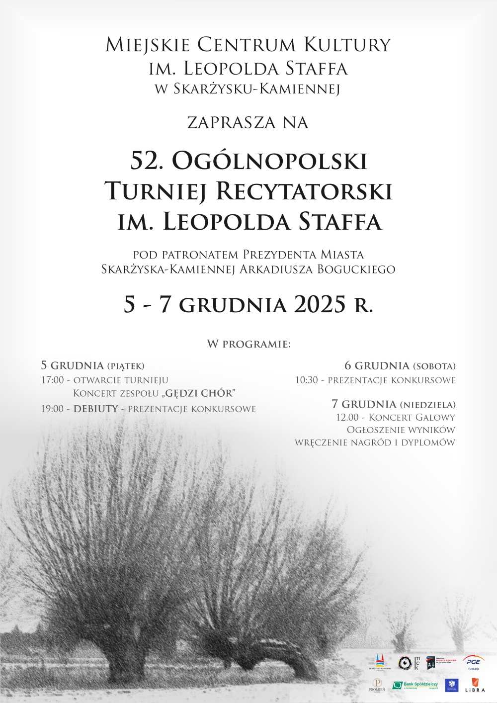 W dniach 5–7 grudnia 2025 r. Miejskie Centrum Kultury stało się przestrzenią twórczych interpretacji, intensywnych emocji i inspirujących spotkań. Turniej — od lat służący doskonaleniu sztuki słowa, wspieraniu twórców-amatorów oraz budowaniu ogólnopolskiej wspólnoty miłośników literatury — ponownie stworzył warunki do prezentowania różnorodnych, wartościowych i często zaskakująco nowatorskich form wypowiedzi artystycznych. Wydarzenie było także okazją do przypomnienia bogatych związków Leopolda Staffa z naszym miastem, które pozostają ważnym elementem lokalnej tradycji literackiej.