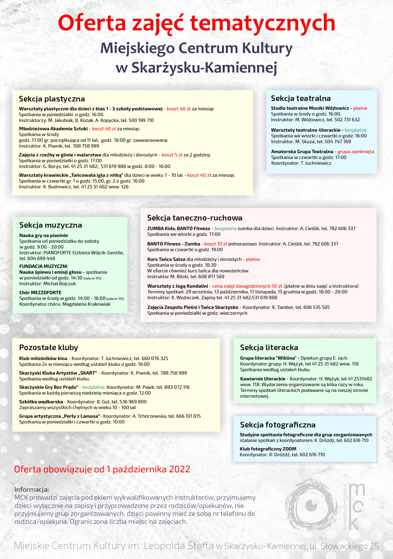 Zapraszamy do zapoznania się z ofertą zajęć tematycznych jakie oferuje MCK Skarżysko na nadchodzący rok szkolny (oferta obowiązuje od 1 października 2022).