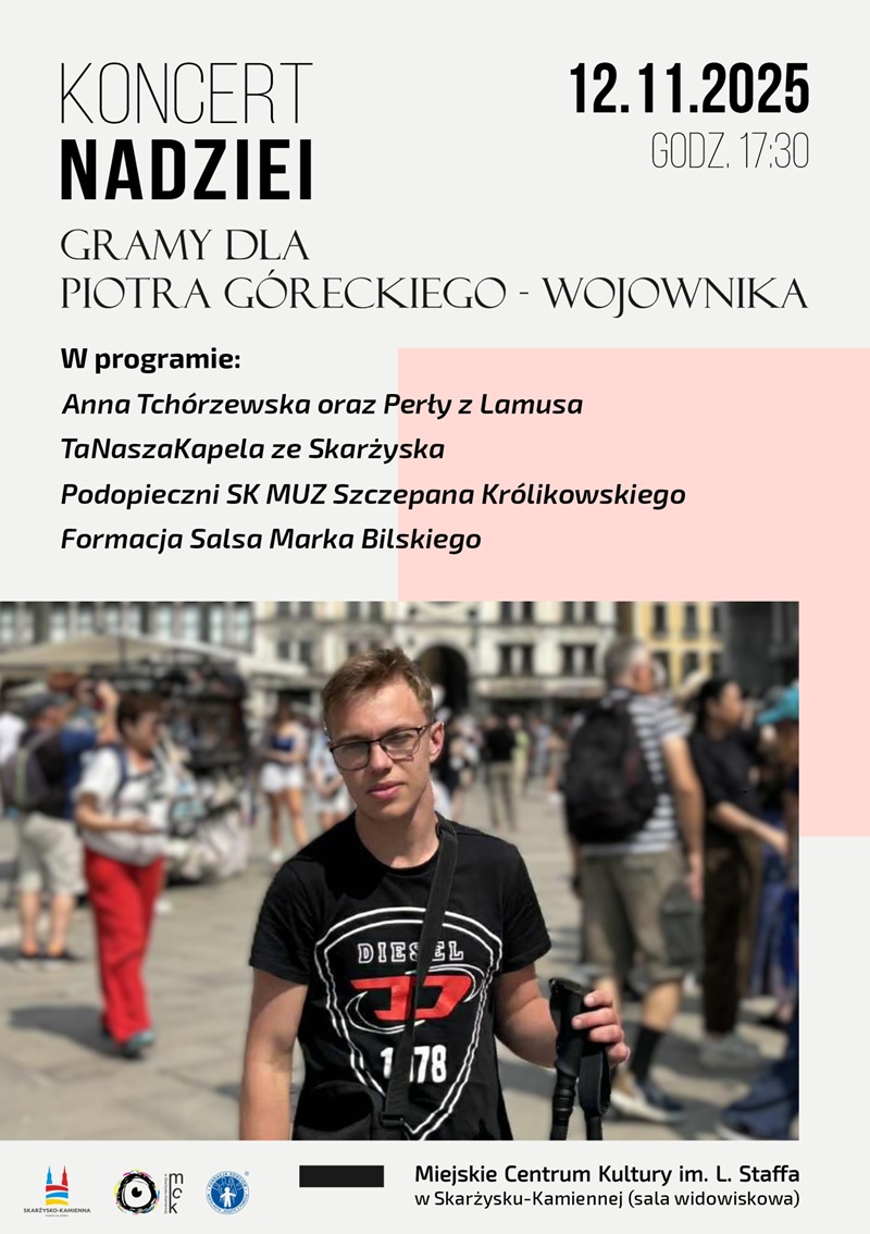 W środowy wieczór, 12 listopada 2025 roku, sala widowiskowa Miejskiego Centrum Kultury w Skarżysku-Kamiennej wypełniła się muzyką, wzruszeniem i prawdziwą solidarnością. Odbył się wyjątkowy koncert charytatywny pod hasłem „Gramy dla Piotra Góreckiego” – niezwykłego człowieka i wojownika, który od miesięcy zmaga się z ciężką chorobą.
